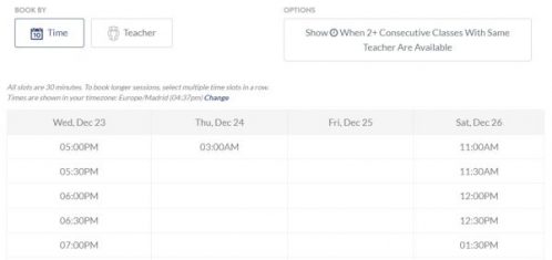 Generally, you can book lessons 5 days in advance. However, if you select a teacher as your favorite, you can access 2 extra days of their schedule. This helps to make sure that you can always schedule classes with them.
