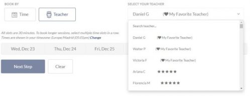 When you find teachers you really like, you can choose to give them a star rating or make them your “favorite teacher” on the platform. Doing this makes it more convenient to book their classes and see their availability.