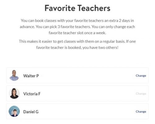 As you start to take classes with different teachers, you’ll quickly find teachers who you have a lot in common with. Some teachers are very energetic and others are more laid back. Some are serious while others laugh and joke around with students. It’s always your choice which teachers you book with, so I suggest finding a few different teachers you enjoy and booking with them when you can.