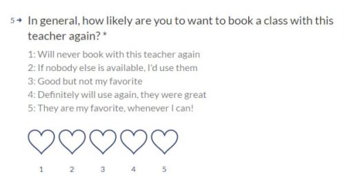 There is no limit on the ratings you can give teachers. The higher the rating you give them, the higher they appear on the list when you’re booking classes. There is a limit on how many “favorite” teachers you can have though – and that’s 3.