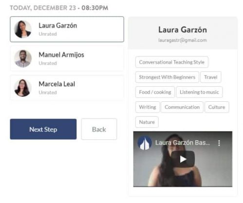 Baselang teachers are all native Spanish speakers from Central and South America, with the majority being Colombian and Venezuelan. Most teachers speak at least some English, and those who don’t speak English are clearly marked on the booking screen. Students can always choose which Baselang teachers they want based on their availability, interests, level of English, and their introduction video.