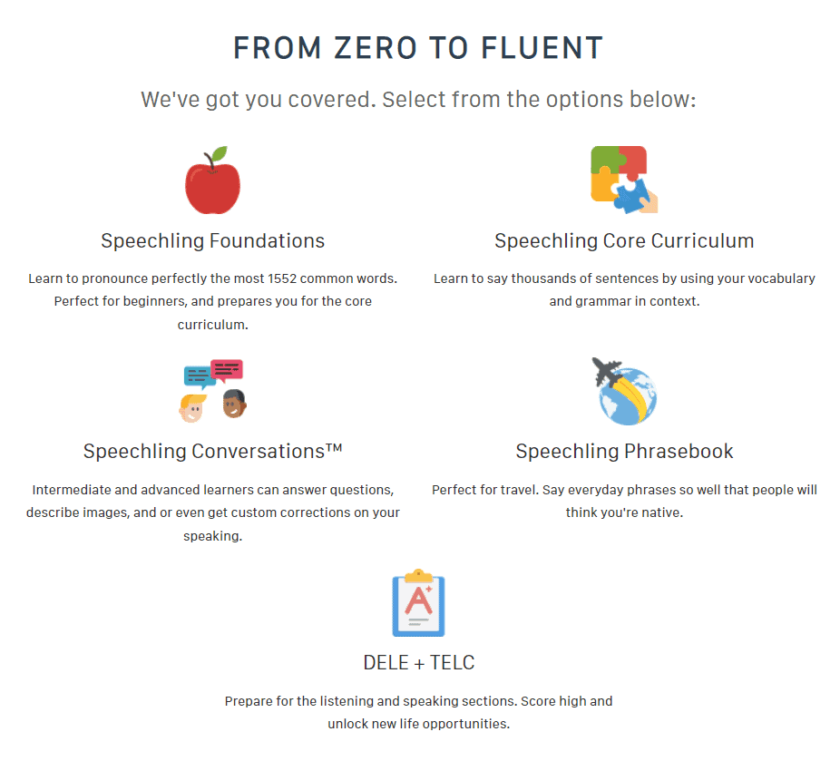 With both the free and paid version, you have access to all 10 languages available. It’s easy to switch between them without losing your progress. The material for each language is the same, so you learn the same words and phrases in each course. Let’s take a look at some of Speechling’s most popular languages.