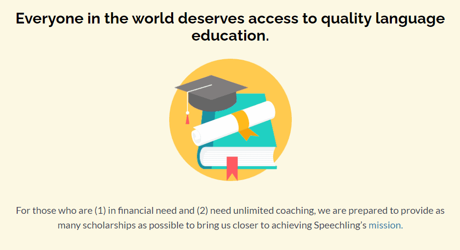 Speechling doesn’t offer a discount. Since they are a nonprofit and their mission is to make language learning accessible to everyone, they offer scholarships to people who have financial or educational needs. To receive a scholarship, you have to submit a video explaining your situation and how you can benefit from using Speeching.
